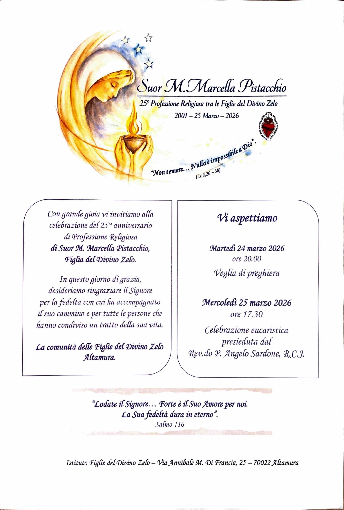 Solennità dell' Annunciazione del Signore. Un giorno di grazia e di gratitudine: celebrato il 25° anniversario di Professione Religiosa di Suor M. Marcella Pistacchio